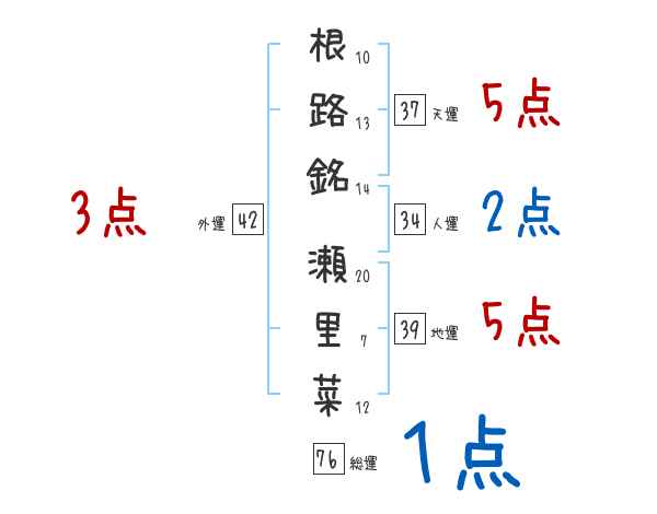 人運![]() | 根路銘瀬里菜さんの人運は34画の2つ星!独創性に優れるが、自尊心が強く災難に注意しましょう。 性格や才能などを表す2番目に重要な運勢です。人間関係や協調性、社会的な成功に影響します。主に20歳から50歳ぐらいまでの中年期の運勢を表します。 |