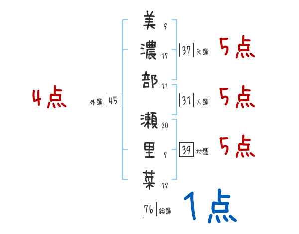 総運![]() | 美濃部瀬里菜さんの総運は76画の1つ星!離散に注意。劣等感を感じ孤立しやすい傾向があるかも。 あなたの人生を表す1番重要な運勢です。生涯を通じて影響する総合運となり、主に50歳以降の晩年期に影響を及ぼします。 |