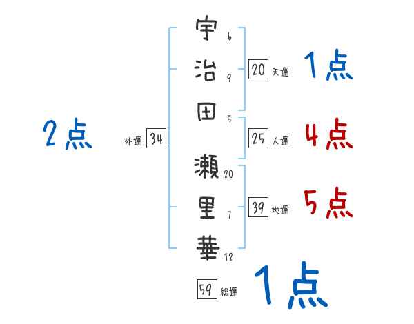 総運![]() | 宇治田瀬里華さんの総運は59画の1つ星!意志の弱さであきらめることが多いかも。粘り強さが必要。 あなたの人生を表す1番重要な運勢です。生涯を通じて影響する総合運となり、主に50歳以降の晩年期に影響を及ぼします。 |