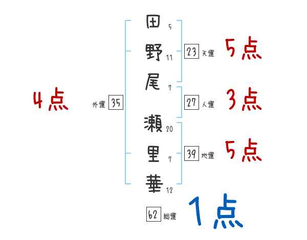 外運![]() | 田野尾瀬里華さんの外運は35画の4つ星!温厚な性格で感受性が高い。穏和な性格で人望が厚い。 生活面を象徴する運勢です。外部から受ける影響力を表し、結婚運、家庭運や職場、環境への順応性を表します。 |