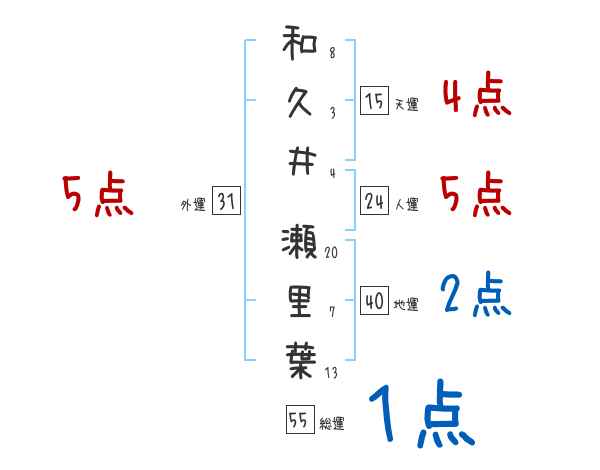 総運![]() | 和久井瀬里葉さんの総運は55画の1つ星!欲張りな性格で軽率な行動に注意しましょう。病気に気をつけて。 あなたの人生を表す1番重要な運勢です。生涯を通じて影響する総合運となり、主に50歳以降の晩年期に影響を及ぼします。 |