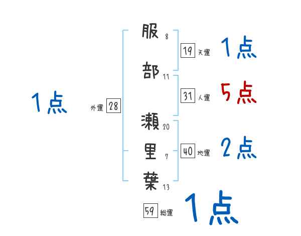 外運![]() | 服部瀬里葉さんの外運は28画の1つ星!家庭環境に注意。スポーツで活躍できる能力があるかも。 生活面を象徴する運勢です。外部から受ける影響力を表し、結婚運、家庭運や職場、環境への順応性を表します。 |