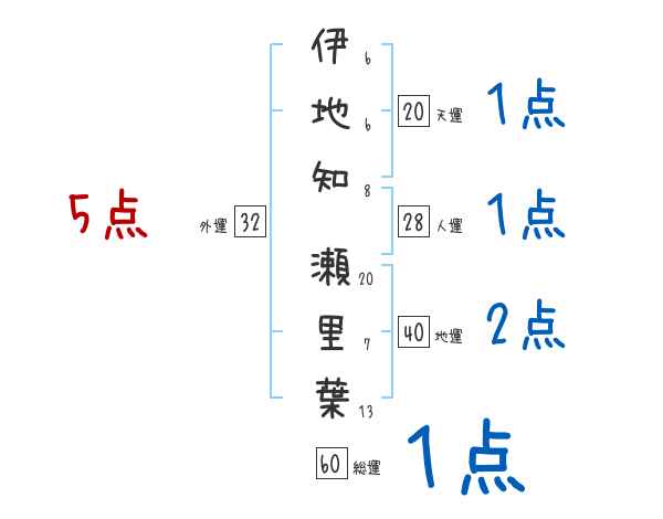 外運![]() | 伊地知瀬里葉さんの外運は32画の5つ星!柔軟性があり成功する。チャンスが多く金運が良い。 生活面を象徴する運勢です。外部から受ける影響力を表し、結婚運、家庭運や職場、環境への順応性を表します。 |