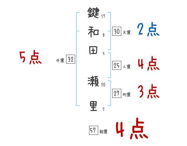 外運![]() | 鍵和田瀬里さんの外運は32画の5つ星!柔軟性があり成功する。チャンスが多く金運が良い。 生活面を象徴する運勢です。外部から受ける影響力を表し、結婚運、家庭運や職場、環境への順応性を表します。 |