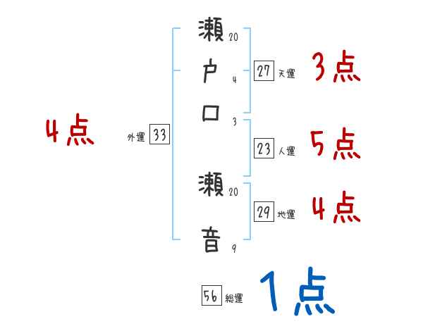 外運![]() | 瀬戸口瀬音さんの外運は33画の4つ星!権力志向でプライドが高い。勇気があり運を切り開き成功する。 生活面を象徴する運勢です。外部から受ける影響力を表し、結婚運、家庭運や職場、環境への順応性を表します。 |
