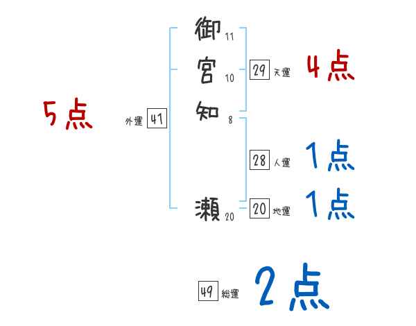 人運![]() | 御宮知瀬さんの人運は28画の1つ星!家庭環境に注意。スポーツで活躍できる能力があるかも。 性格や才能などを表す2番目に重要な運勢です。人間関係や協調性、社会的な成功に影響します。主に20歳から50歳ぐらいまでの中年期の運勢を表します。 |