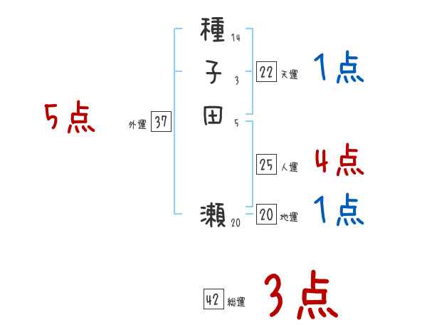 外運![]() | 種子田瀬さんの外運は37画の5つ星!努力家で順応性に優れる。現実的な考え方ができ忠実に物事をこなす。 生活面を象徴する運勢です。外部から受ける影響力を表し、結婚運、家庭運や職場、環境への順応性を表します。 |