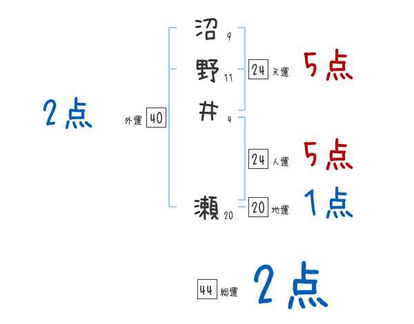 天運![]() | 沼野井瀬さんの天運は24画の5つ星!家庭運が良く順調な人生。金運にも恵まれる。 家系が持つ宿命的な運勢を表します。祖先から受け継いだ苗字ですので自分の力が及びません。家柄を象徴します。 |