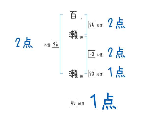 外運![]() | 百瀬瀬さんの外運は26画の2つ星!波瀾万丈かも。信頼できる人を大事にしましょう。 生活面を象徴する運勢です。外部から受ける影響力を表し、結婚運、家庭運や職場、環境への順応性を表します。 |