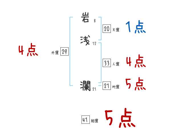 外運![]() | 岩浅瀾さんの外運は29画の4つ星!完全主義で才能がある。厳格な心の持ち主。 生活面を象徴する運勢です。外部から受ける影響力を表し、結婚運、家庭運や職場、環境への順応性を表します。 |
