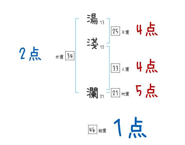 天運![]() | 湯淺瀾さんの天運は25画の4つ星!個性があり才能があふれる。強運の持ち主で発展する。 家系が持つ宿命的な運勢を表します。祖先から受け継いだ苗字ですので自分の力が及びません。家柄を象徴します。 |