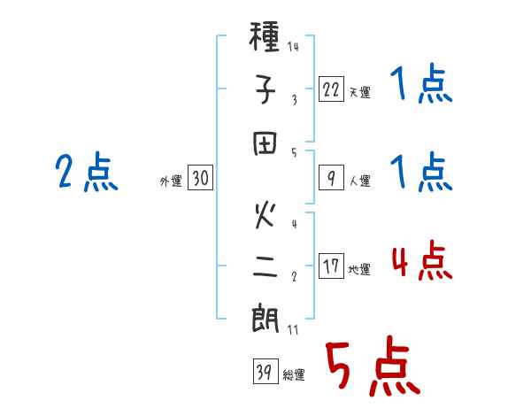 総運![]() | 種子田火二朗さんの総運は39画の5つ星!社交性に優れ人望が厚い。人の上に立ち成功する。 あなたの人生を表す1番重要な運勢です。生涯を通じて影響する総合運となり、主に50歳以降の晩年期に影響を及ぼします。 |