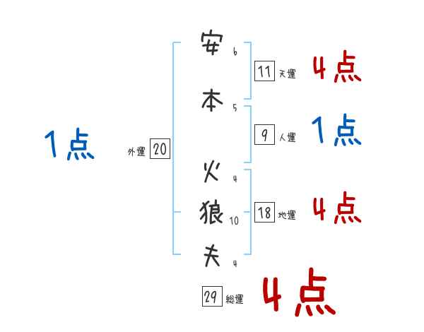 天運![]() | 安本火狼夫さんの天運は11画の4つ星!着実に富や地位を得る幸運な人生。 家系が持つ宿命的な運勢を表します。祖先から受け継いだ苗字ですので自分の力が及びません。家柄を象徴します。 |