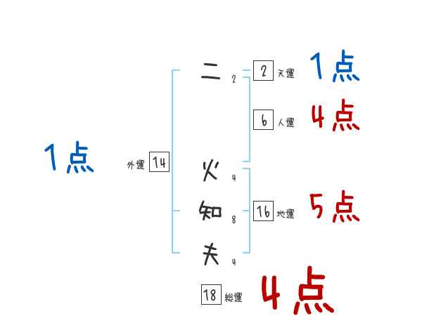 外運![]() | 二火知夫さんの外運は14画の1つ星!人に対して優しいがストレスを溜め込みがち。人間関係のトラブルを避けるよう気をつけましょう。 生活面を象徴する運勢です。外部から受ける影響力を表し、結婚運、家庭運や職場、環境への順応性を表します。 |