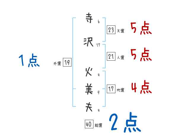天運![]() | 寺沢火美夫さんの天運は23画の5つ星!想像力に優れ活力がある。一代で成功し名誉を手に入れる。 家系が持つ宿命的な運勢を表します。祖先から受け継いだ苗字ですので自分の力が及びません。家柄を象徴します。 |