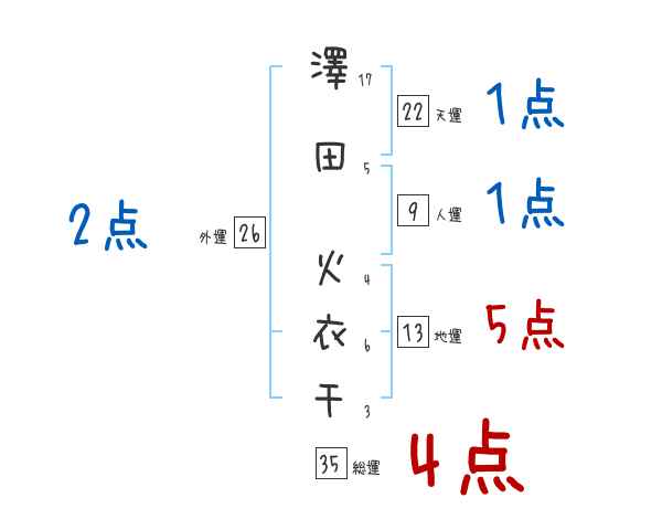 外運![]() | 澤田火衣千さんの外運は26画の2つ星!波瀾万丈かも。信頼できる人を大事にしましょう。 生活面を象徴する運勢です。外部から受ける影響力を表し、結婚運、家庭運や職場、環境への順応性を表します。 |