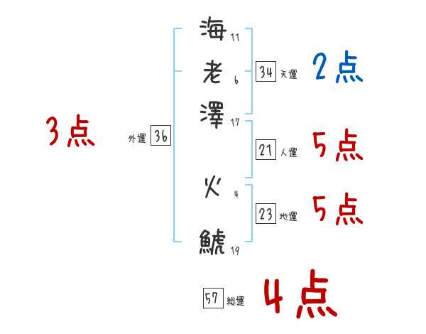 天運![]() | 海老澤火鯱さんの天運は34画の2つ星!独創性に優れるが、自尊心が強く災難に注意しましょう。 家系が持つ宿命的な運勢を表します。祖先から受け継いだ苗字ですので自分の力が及びません。家柄を象徴します。 |