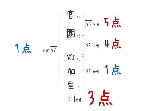 天運![]() | 宮園灯加里さんの天運は23画の5つ星!想像力に優れ活力がある。一代で成功し名誉を手に入れる。 家系が持つ宿命的な運勢を表します。祖先から受け継いだ苗字ですので自分の力が及びません。家柄を象徴します。 |