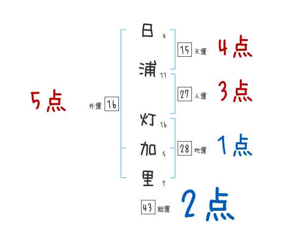 外運![]() | 日浦灯加里さんの外運は16画の5つ星!人望が厚く大きく発展する。逆転成功が見える。 生活面を象徴する運勢です。外部から受ける影響力を表し、結婚運、家庭運や職場、環境への順応性を表します。 |