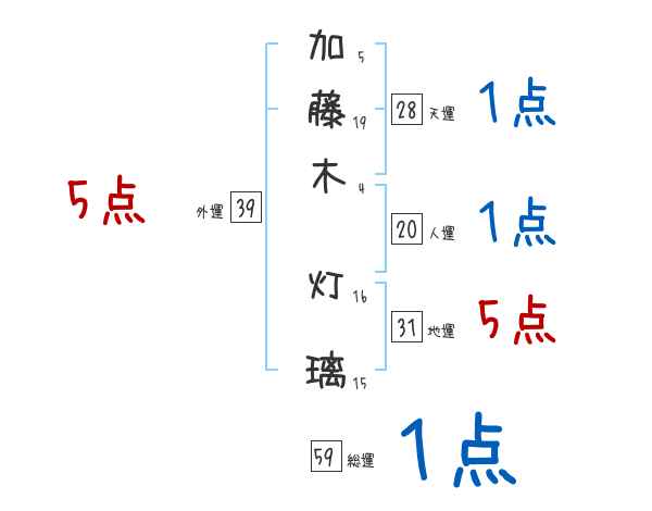 総運![]() | 加藤木灯璃さんの総運は59画の1つ星!意志の弱さであきらめることが多いかも。粘り強さが必要。 あなたの人生を表す1番重要な運勢です。生涯を通じて影響する総合運となり、主に50歳以降の晩年期に影響を及ぼします。 |