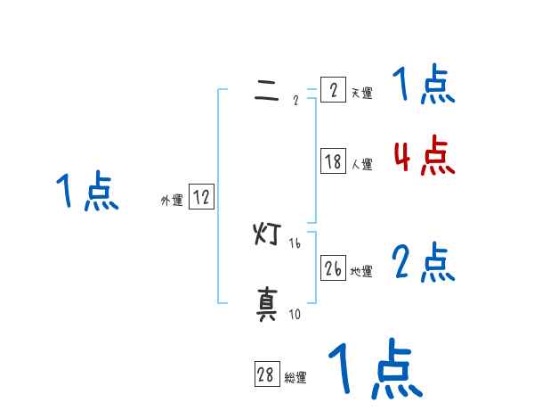 総運![]() | 二灯真さんの総運は28画の1つ星!家庭環境に注意。スポーツで活躍できる能力があるかも。 あなたの人生を表す1番重要な運勢です。生涯を通じて影響する総合運となり、主に50歳以降の晩年期に影響を及ぼします。 |