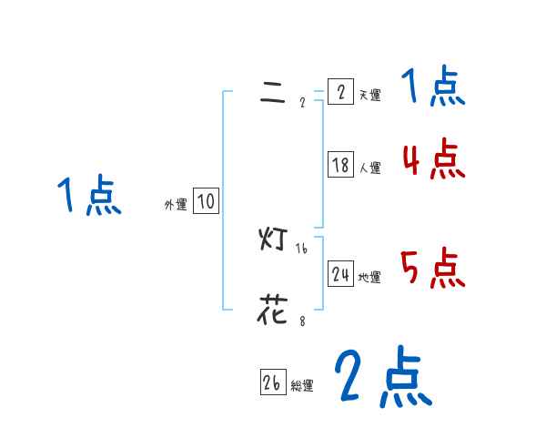 外運![]() | 二灯花さんの外運は10画の1つ星!不安を感じやすい傾向。ストレスを抱えないように注意しましょう。 生活面を象徴する運勢です。外部から受ける影響力を表し、結婚運、家庭運や職場、環境への順応性を表します。 |