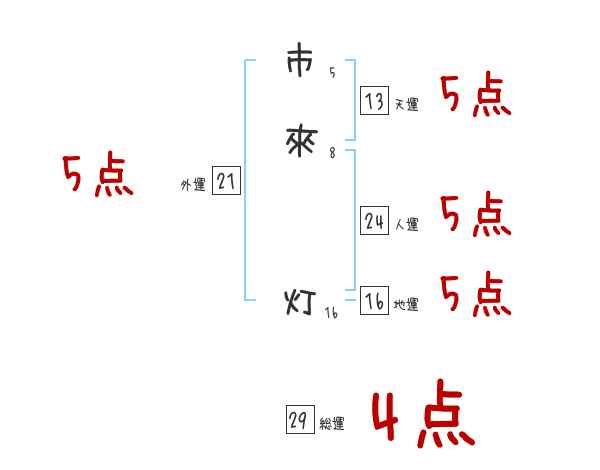 人運![]() | 市來灯さんの人運は24画の5つ星!家庭運が良く順調な人生。金運にも恵まれる。 性格や才能などを表す2番目に重要な運勢です。人間関係や協調性、社会的な成功に影響します。主に20歳から50歳ぐらいまでの中年期の運勢を表します。 |
