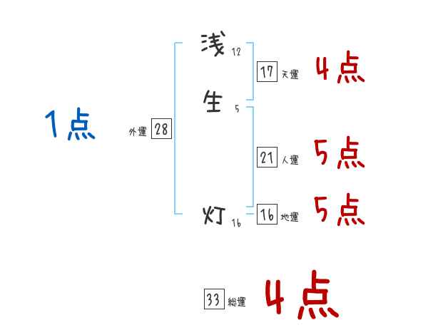 外運![]() | 浅生灯さんの外運は28画の1つ星!家庭環境に注意。スポーツで活躍できる能力があるかも。 生活面を象徴する運勢です。外部から受ける影響力を表し、結婚運、家庭運や職場、環境への順応性を表します。 |