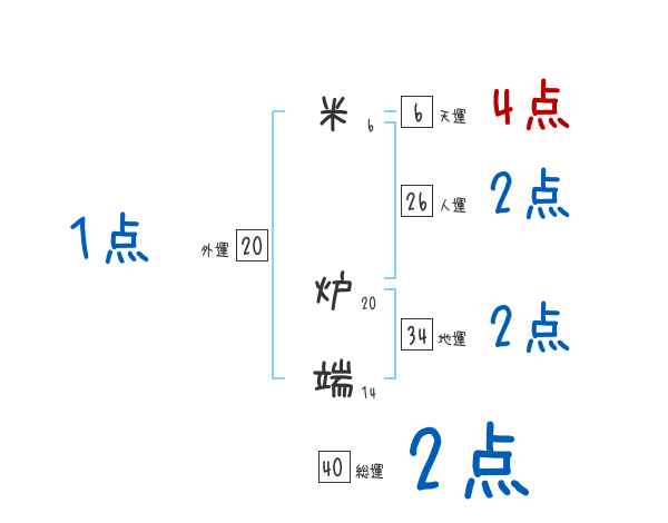 天運![]() | 米炉端さんの天運は6画の4つ星!慎重な努力家で信頼を得る。誠実な精神で向上心に優れる。 家系が持つ宿命的な運勢を表します。祖先から受け継いだ苗字ですので自分の力が及びません。家柄を象徴します。 |