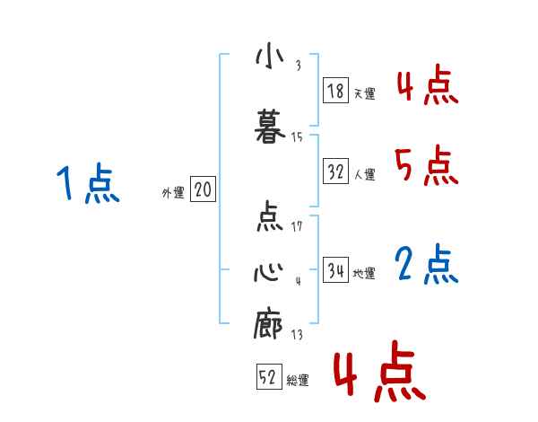 天運![]() | 小暮点心廊さんの天運は18画の4つ星!情熱的で剛気。忍耐力があり信頼される。 家系が持つ宿命的な運勢を表します。祖先から受け継いだ苗字ですので自分の力が及びません。家柄を象徴します。 |