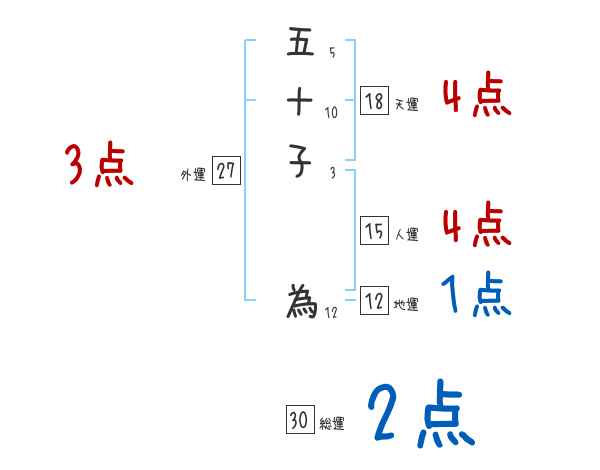 天運![]() | 五十子為さんの天運は18画の4つ星!情熱的で剛気。忍耐力があり信頼される。 家系が持つ宿命的な運勢を表します。祖先から受け継いだ苗字ですので自分の力が及びません。家柄を象徴します。 |