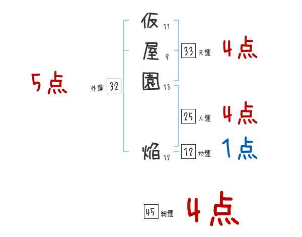 外運![]() | 仮屋園焔さんの外運は32画の5つ星!柔軟性があり成功する。チャンスが多く金運が良い。 生活面を象徴する運勢です。外部から受ける影響力を表し、結婚運、家庭運や職場、環境への順応性を表します。 |