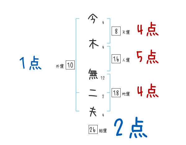 人運![]() | 今木無二夫さんの人運は16画の5つ星!人望が厚く大きく発展する。逆転成功が見える。 性格や才能などを表す2番目に重要な運勢です。人間関係や協調性、社会的な成功に影響します。主に20歳から50歳ぐらいまでの中年期の運勢を表します。 |