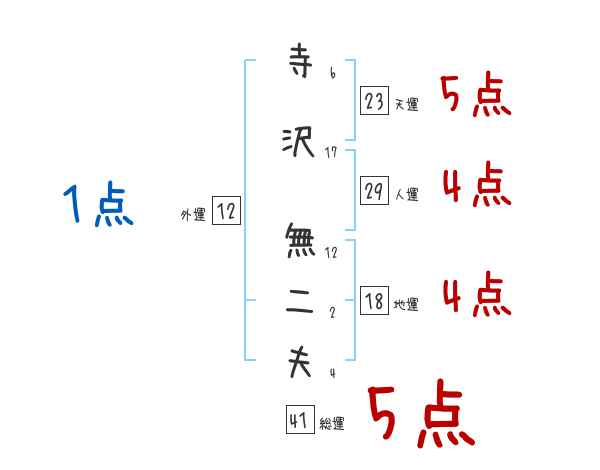 天運![]() | 寺沢無二夫さんの天運は23画の5つ星!想像力に優れ活力がある。一代で成功し名誉を手に入れる。 家系が持つ宿命的な運勢を表します。祖先から受け継いだ苗字ですので自分の力が及びません。家柄を象徴します。 |