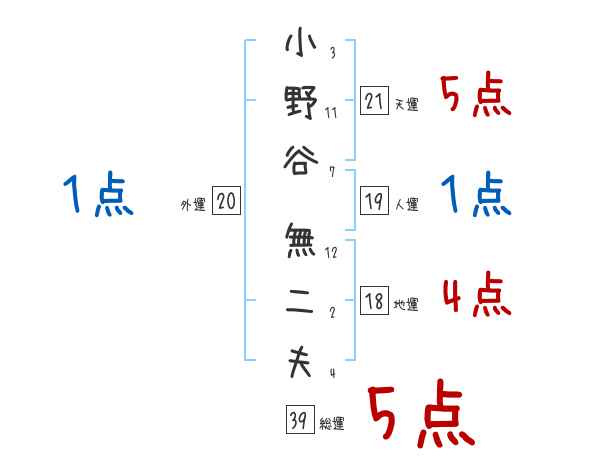 天運![]() | 小野谷無二夫さんの天運は21画の5つ星!統率力がある。独立し成功する。名誉を手に入れる。 家系が持つ宿命的な運勢を表します。祖先から受け継いだ苗字ですので自分の力が及びません。家柄を象徴します。 |