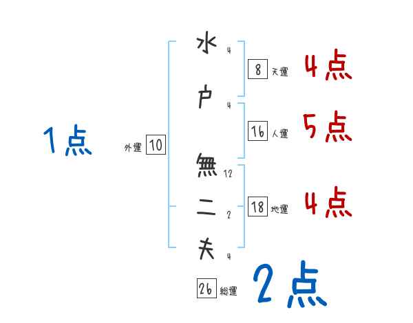 総運![]() | 水戸無二夫さんの総運は26画の2つ星!波瀾万丈かも。信頼できる人を大事にしましょう。 あなたの人生を表す1番重要な運勢です。生涯を通じて影響する総合運となり、主に50歳以降の晩年期に影響を及ぼします。 |