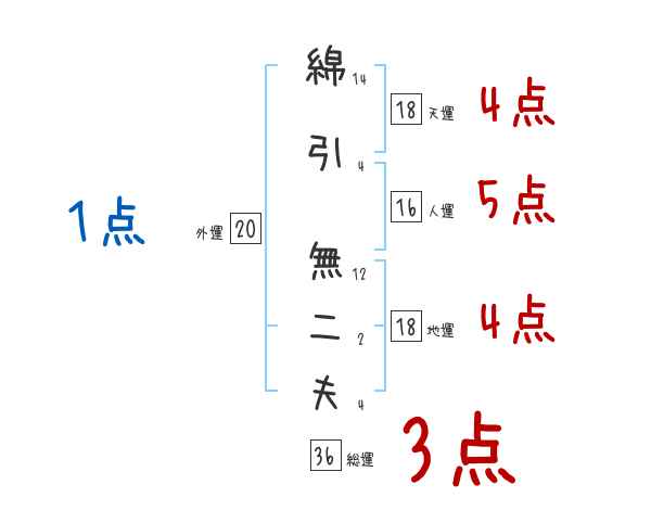 人運![]() | 綿引無二夫さんの人運は16画の5つ星!人望が厚く大きく発展する。逆転成功が見える。 性格や才能などを表す2番目に重要な運勢です。人間関係や協調性、社会的な成功に影響します。主に20歳から50歳ぐらいまでの中年期の運勢を表します。 |