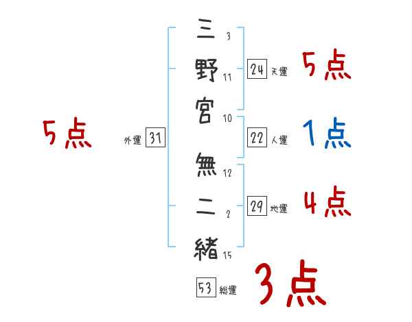 総運![]() | 三野宮無二緒さんの総運は53画の3つ星!やや見栄っ張りで虚栄心がある。散財に注意。 あなたの人生を表す1番重要な運勢です。生涯を通じて影響する総合運となり、主に50歳以降の晩年期に影響を及ぼします。 |