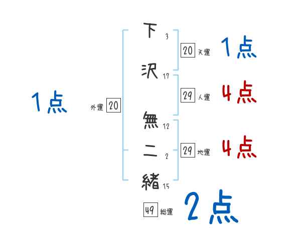 人運![]() | 下沢無二緒さんの人運は29画の4つ星!完全主義で才能がある。厳格な心の持ち主。 性格や才能などを表す2番目に重要な運勢です。人間関係や協調性、社会的な成功に影響します。主に20歳から50歳ぐらいまでの中年期の運勢を表します。 |