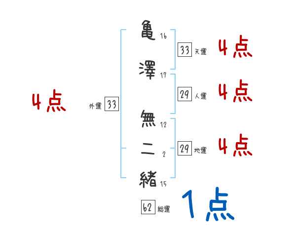外運![]() | 亀澤無二緒さんの外運は33画の4つ星!権力志向でプライドが高い。勇気があり運を切り開き成功する。 生活面を象徴する運勢です。外部から受ける影響力を表し、結婚運、家庭運や職場、環境への順応性を表します。 |