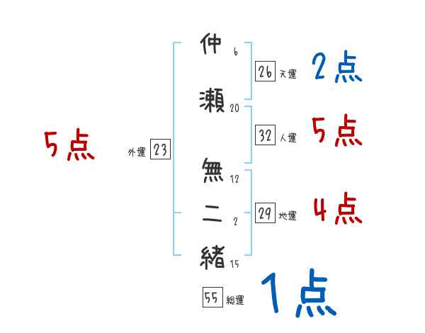 人運![]() | 仲瀬無二緒さんの人運は32画の5つ星!柔軟性があり成功する。チャンスが多く金運が良い。 性格や才能などを表す2番目に重要な運勢です。人間関係や協調性、社会的な成功に影響します。主に20歳から50歳ぐらいまでの中年期の運勢を表します。 |