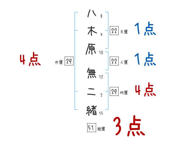 外運![]() | 八木原無二緒さんの外運は29画の4つ星!完全主義で才能がある。厳格な心の持ち主。 生活面を象徴する運勢です。外部から受ける影響力を表し、結婚運、家庭運や職場、環境への順応性を表します。 |