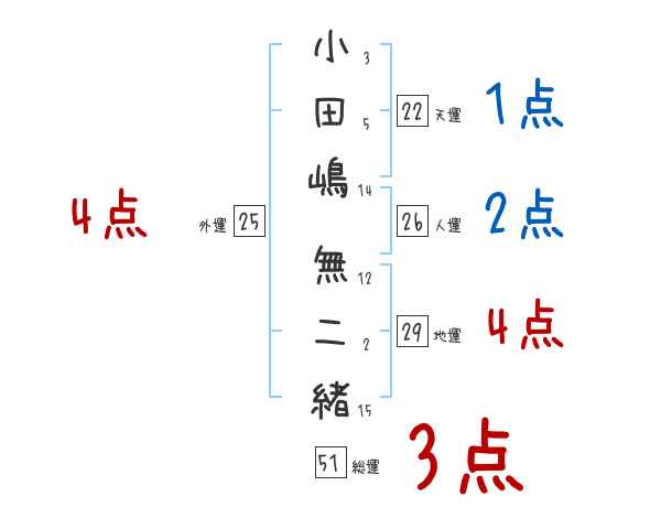 総運![]() | 小田嶋無二緒さんの総運は51画の3つ星!変化が激しく、危険に注意。堅実な性格。 あなたの人生を表す1番重要な運勢です。生涯を通じて影響する総合運となり、主に50歳以降の晩年期に影響を及ぼします。 |