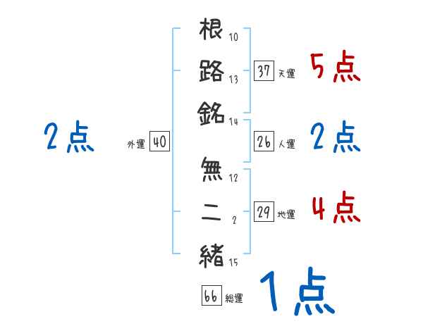 外運![]() | 根路銘無二緒さんの外運は40画の2つ星!自信過剰で物事に固執するためトラブルに注意。 生活面を象徴する運勢です。外部から受ける影響力を表し、結婚運、家庭運や職場、環境への順応性を表します。 |