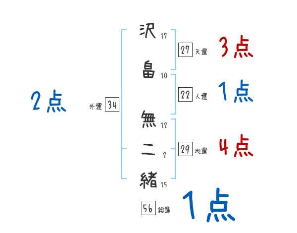 外運![]() | 沢畠無二緒さんの外運は34画の2つ星!独創性に優れるが、自尊心が強く災難に注意しましょう。 生活面を象徴する運勢です。外部から受ける影響力を表し、結婚運、家庭運や職場、環境への順応性を表します。 |