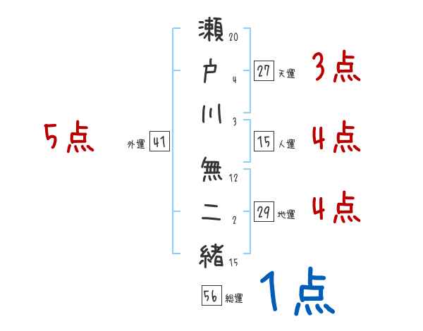 天運![]() | 瀬戸川無二緒さんの天運は27画の3つ星!頭脳明晰だが強情で摩擦が多い傾向。孤立に注意。 家系が持つ宿命的な運勢を表します。祖先から受け継いだ苗字ですので自分の力が及びません。家柄を象徴します。 |