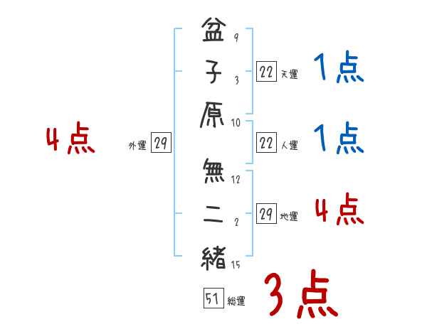 天運![]() | 盆子原無二緒さんの天運は22画の1つ星!努力することが苦手ないっぽう手先が器用。芸術性にも優れる。 家系が持つ宿命的な運勢を表します。祖先から受け継いだ苗字ですので自分の力が及びません。家柄を象徴します。 |