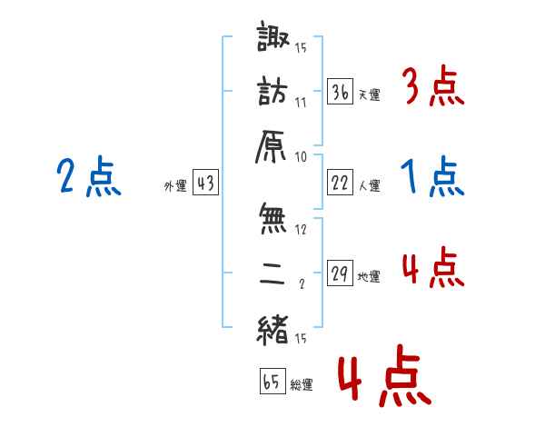 総運![]() | 諏訪原無二緒さんの総運は65画の4つ星!幸運に恵まれ繁栄する。包容力がある。 あなたの人生を表す1番重要な運勢です。生涯を通じて影響する総合運となり、主に50歳以降の晩年期に影響を及ぼします。 |