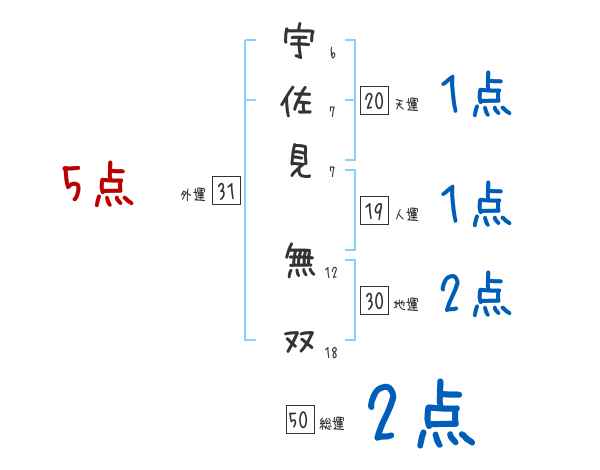 総運![]() | 宇佐見無双さんの総運は50画の2つ星!浮き沈みが激しく不安定。しりすぼみに衰退しやすいので注意しましょう。 あなたの人生を表す1番重要な運勢です。生涯を通じて影響する総合運となり、主に50歳以降の晩年期に影響を及ぼします。 |