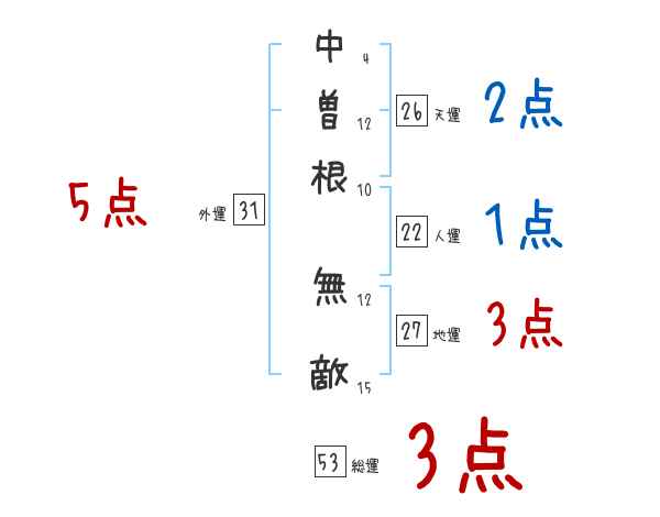 総運![]() | 中曽根無敵さんの総運は53画の3つ星!やや見栄っ張りで虚栄心がある。散財に注意。 あなたの人生を表す1番重要な運勢です。生涯を通じて影響する総合運となり、主に50歳以降の晩年期に影響を及ぼします。 |